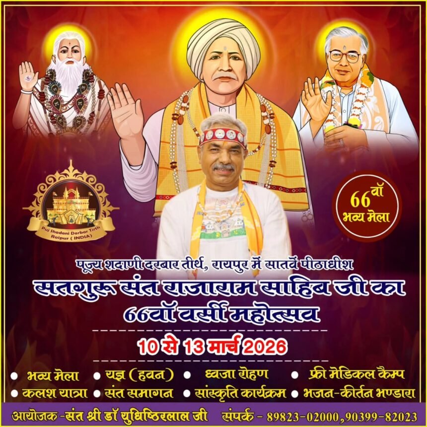 रायपुर। पूज्य शदाणी दरबार तीर्थ, रायपुर में सातवें पीठाधीश सतगुरु संतश्री राजाराम साहिब जी का 66वां वर्षोत्सव महोत्सव बड़े ही श्रद्धा, भक्ति और उत्साह के साथ मनाया जाएगा। यह भव्य आयोजन 10 मार्च से 13 मार्च 2026 तक आयोजित होगा, जिसमें देशभर से संत-महात्मा, श्रद्धालु और समाजजन बड़ी संख्या में शामिल होंगे।