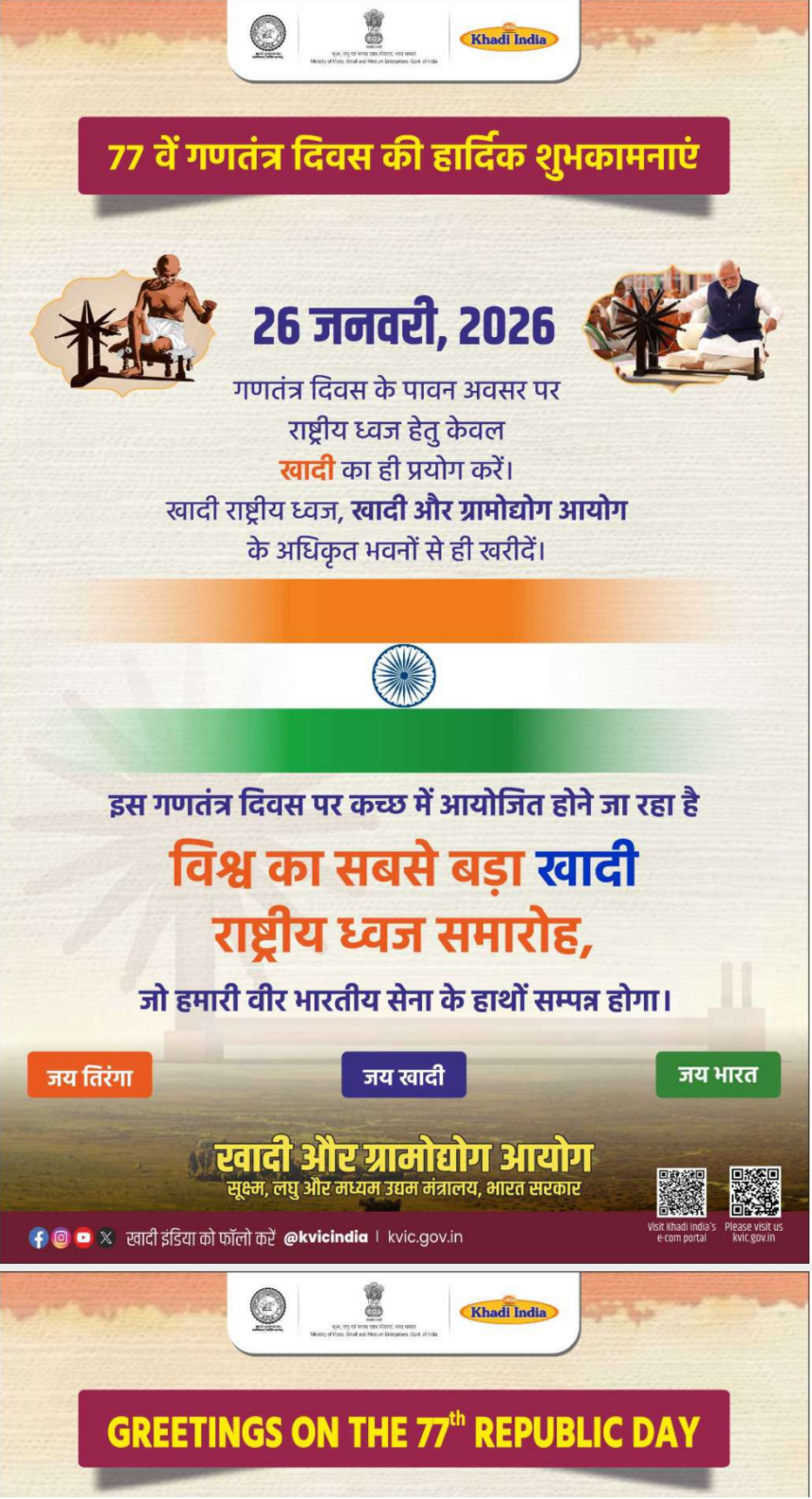 इस वर्ष गणतंत्र दिवस पर कच्छ में विश्व का सबसे बड़ा खादी राष्ट्रीय ध्वज समारोह आयोजित होने जा रहा है, जिसे हमारी वीर भारतीय सेना के हाथों समर्पित किया जाएगा। यह आयोजन देश की सैन्य शक्ति, आत्मनिर्भर भारत अभियान और स्वदेशी उत्पादों के सम्मान का प्रतीक बनेगा।