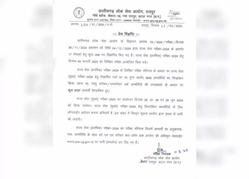 रायपुर: छत्तीसगढ़ लोक सेवा आयोग (CGPSC) ने प्रीलिम्स 2024 का रिजल्ट जारी कर दिया है। इस परीक्षा के माध्यम से डिप्टी कलेक्टर, डीएसपी, आबकारी सब इंस्पेक्टर समेत 17 सेवाओं के 246 पदों पर भर्ती की जाएगी। परीक्षा 9 फरवरी 2025 को दो पालियों में आयोजित हुई थी। जारी परिणाम के अनुसार, कुल 3737 अभ्यर्थियों ने मुख्य परीक्षा (मेंस) के लिए क्वालीफाई किया है। अभ्यर्थी अपना परिणाम आयोग की आधिकारिक वेबसाइट psc.cg.gov.in पर देख सकते हैं।