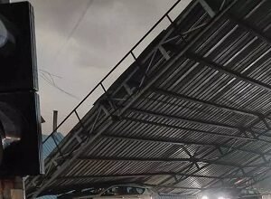 सिमगा रोड में टोल नाके का शेड आंधी तूफान से गिरा, आवागमन प्रभावित