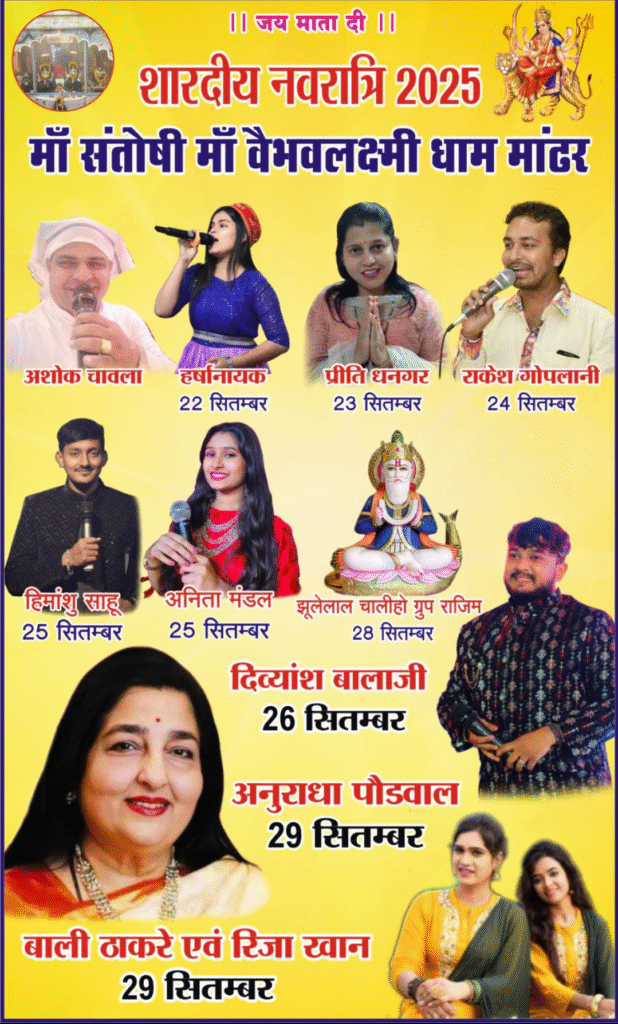 रात्रि 9:30 बजे से भारतवर्ष की मशहूर भजन सम्राट पद्मश्री अनुराधा पौडवाल एवं जबलपुर की सुप्रसिद्ध भजन गायिका बाली ठाकरे और रिजा खान ( मां शारदा ग्रुप जबलपुर ) की टीम द्वारा माता का जागरण एवं भक्ति में कार्यक्रम रखा गया है आप सभी भक्तगणों से आग्रह है की सब परिवार आकर माता का आशीर्वाद और भक्ति में कार्यक्रम का लाभ लें यह सारा कार्यक्रम मांडर स्थित मां वैभव लक्ष्मी धाम स्टेशन के सामने रखा गया है