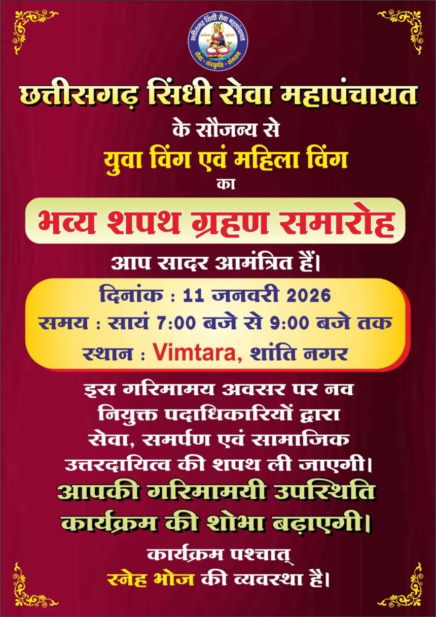 प्रवक्ता दिनेश आनंद ने आगे बताया कल के शपथग्रहण समारोह में छग के 150 युवा एवं महिला टीम के पदाधिकारी शपथग्रहण करेंगे।।जिसमें प्रमुखतः पदाधिकारी रायपुर, दल्लीराजहरा, दुर्ग, भिलाई,भाटापारा, टिल्डा,बिलासपुर,कोरबा, महासमुंद, गरियाबंद, चारामा,बसना, मुंगेली, गरियाबंद,तखतपुर, जगदलपुर, धमतरी, रायगढ़,छुरा आदि से पदाधिकारी गण शामिल होंगे।।प्रवक्ता दिनेश आनंद अठवानी के अनुसार महापंचायत के संरक्षक श्रीचंद सुंदरानी व अध्यक्ष अमर गिदवानी का सदैव सबको एक साथ लेकर चलने के सिद्धांत की झलक समाज की प्रत्येक कार्यक्रम एवं गतिविधि में देखने मिलती है।।इससे ही आज छग सिंधी समाज की एकजुटता देखने मिलती है।।