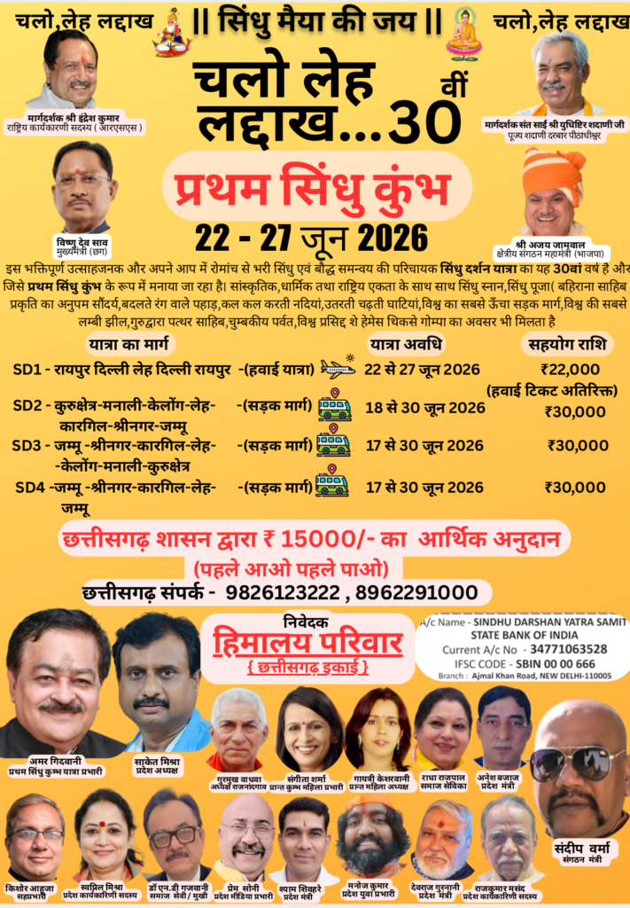छत्तीसगढ़ सहित पूरे देश के श्रद्धालुओं के लिए गौरव का विषय बनते हुए इस वर्ष 30वीं सिंधु दर्शन यात्रा को “प्रथम सिंधु कुंभ” के रूप में मनाया जा रहा है। “चलो लेह लद्दाख” के उद्घोष के साथ यह भव्य धार्मिक एवं सांस्कृतिक आयोजन 22 जून से 27 जून 2026 तक आयोजित होगा, जिसमें देशभर से हजारों श्रद्धालु भाग लेंगे।