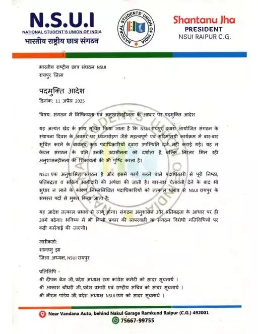 NSUI रायपुर जिला अध्यक्ष शांतनु झा ने बताया कि ये फैसला सिर्फ़ इसलिए लिया गया है, क्योंकि कई लोग लंबे वक्त से संगठन की गतिविधियों से दूर हैं। हाल ही में जब NSUI का स्थापना दिवस मनाया गया, तब भी कई पदाधिकारी नदारद रहे। इससे साफ हो गया कि कुछ लोग सिर्फ नाम के लिए पद पर हैं, न तो काम कर रहे हैं और न ही संगठन को समय दे रहे हैं। शांतनु ने साफ कहा, “NSUI कोई टाइमपास करने की जगह नहीं है। ये मंच उन युवाओं का है, जो विचारधारा के लिए, स्टूडेंट्स की आवाज़ बनने के लिए काम करते हैं।