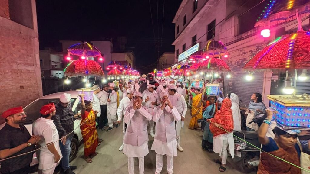 शोभायात्रा में हरे माधव परिवार की संगत विभिन्न वेशभूषाओं में माताएं बहनें कलश उठाये,